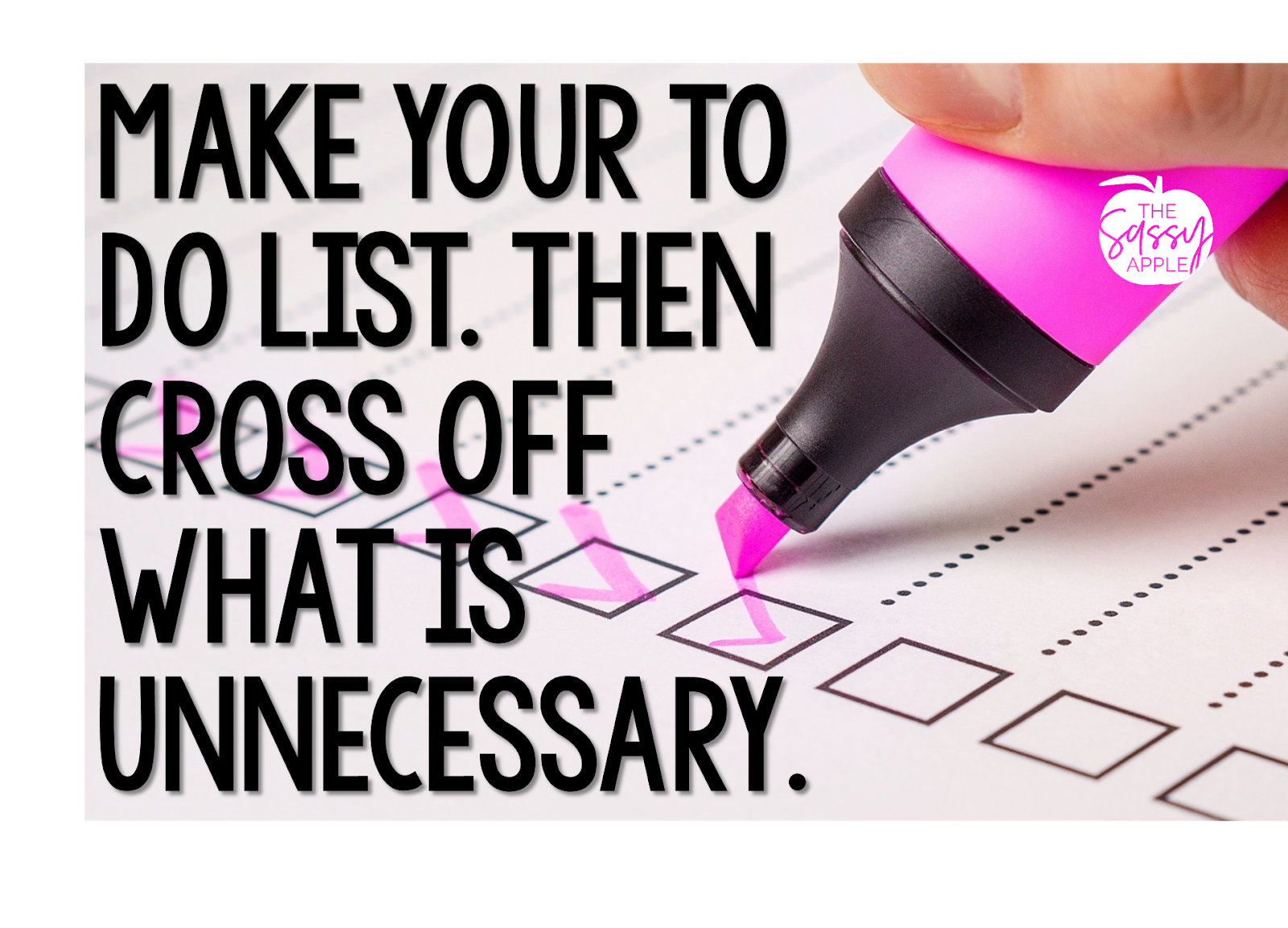 Let go of trying to do everything. Make your lists. Prioritize and cross out the unimportant stuff. Does it really matter if your students get laminated homework coupons printed in color with an individual inspirational message on each one? Do your kids need their lunch to include a star-shaped PBJ and spiraled carrots? While you might set these expectations for yourself in your own head, unless you’ve verbalized it, your students/own kids have NO clue that you intended to prep an Escape room challenge or make individualized party favors. This leads me to my next tip…